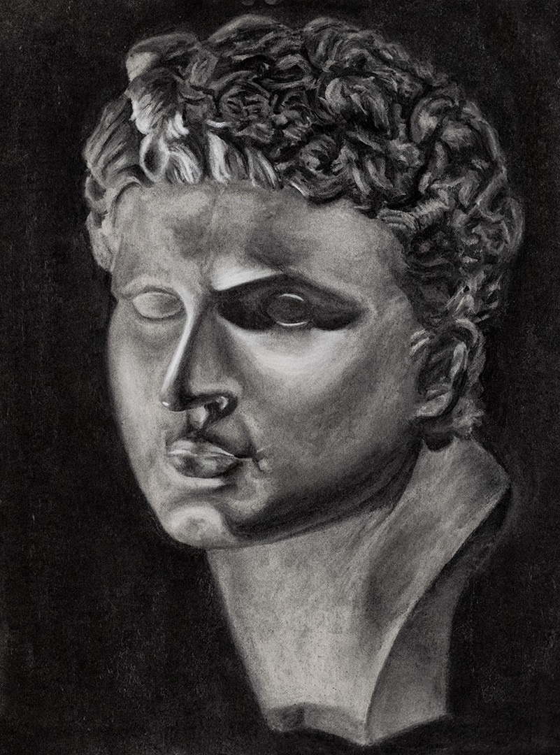 This cast drawing was a way to measure how much I improved in drawing with charcoal. At the beginning of the Fall 2022 semester, I drew a plaster cast that was done from my own skills before completing the drawing fundamental class. There was a clear difference between the two drawings where I looked at each part of the plaster cast as individual shapes rather than a part of a face or locks of hair. This was drawn based on observation, so I had to use various methods to recreate it on paper. To start, I made a ground to box in the overall shape and used the landscaping method to get close to accurate proportions. The drawing began rough, but I kept refining each area until it was finished. I ensured the parts of the face closer to the viewer had a higher contrast and sharpness. That would give the drawing the illusion that it was three dimensional.
